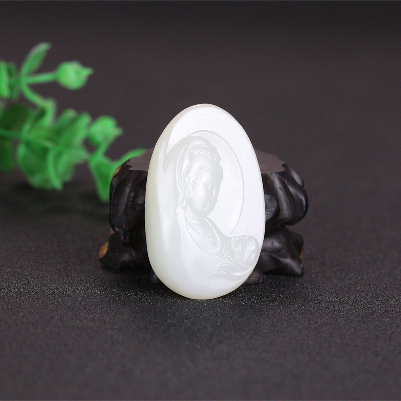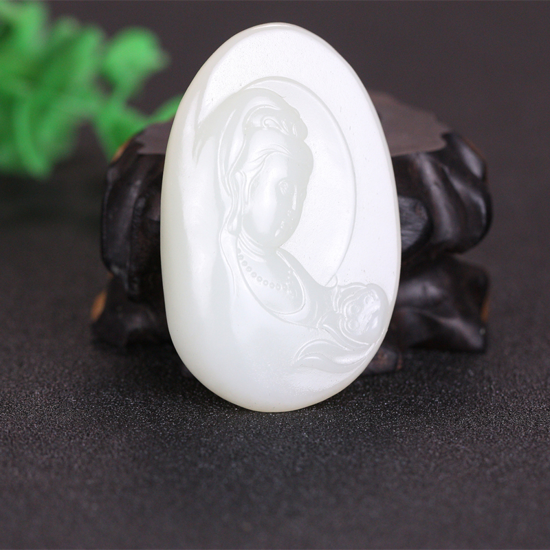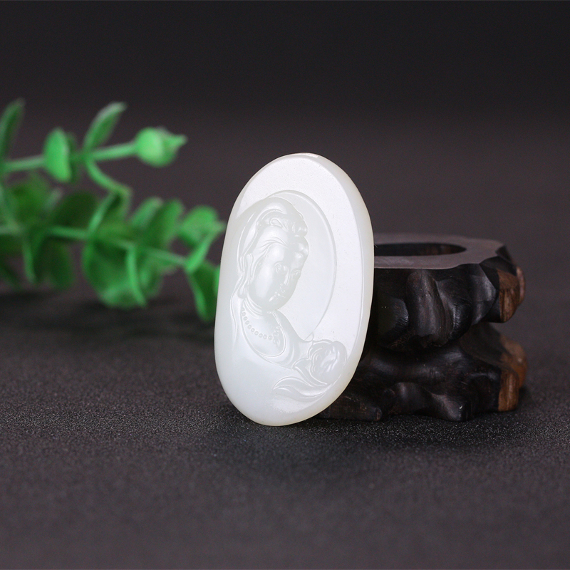 玉质致密, 油润细腻,手感舒畅,洁净通透, 立体雕刻,方正大气,质感十足,佩戴舒适,观音菩萨慈眉善目, 悠然脱俗。