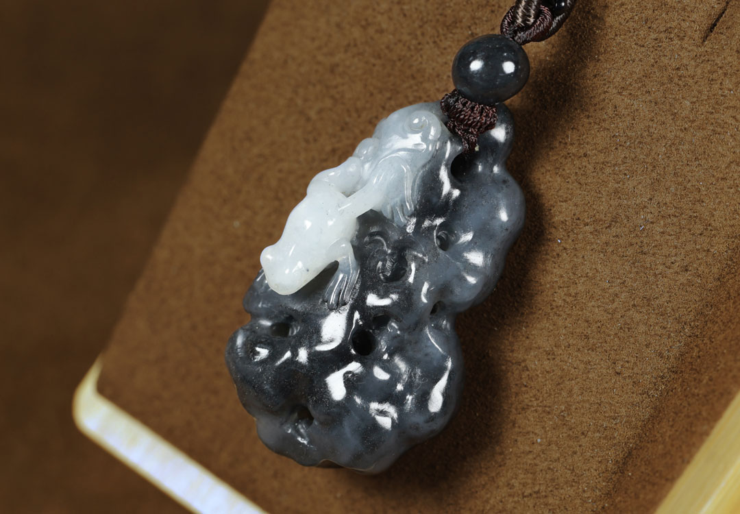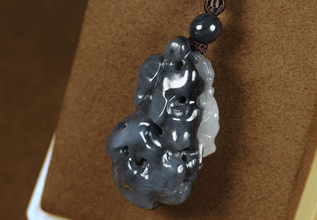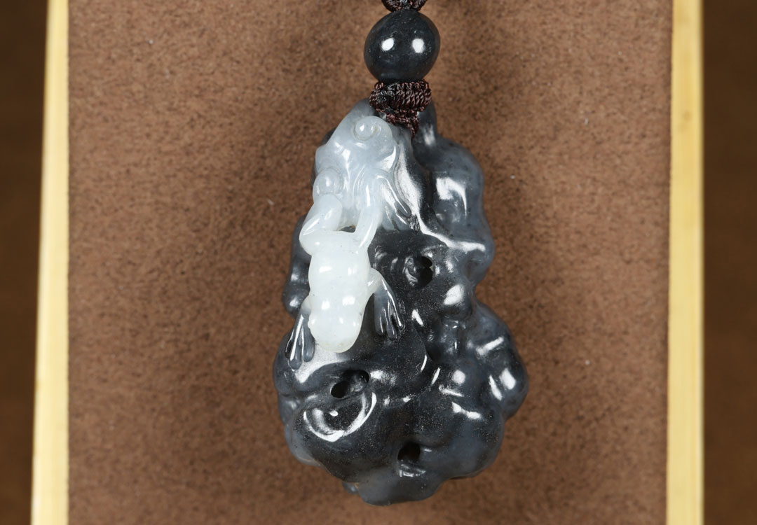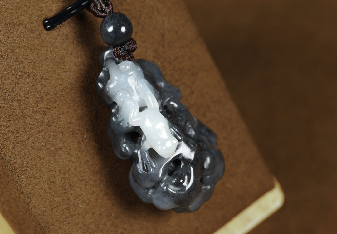 This Hetian jade blue and white seed material “Guagua Laicai” pendant features fine and 温润 (warm and smooth) jade texture, excellent oiliness, rich greasy feeling, distinct black and white colors, and natural ink color rendering. The seed material has a dense and oily texture with a restrained luster, no obvious impurities or cracks. It is exquisitely carved with black and white colors, having a vivid and unique shape, implying fortune transformation, blessing invocation, and smooth progress in everything.