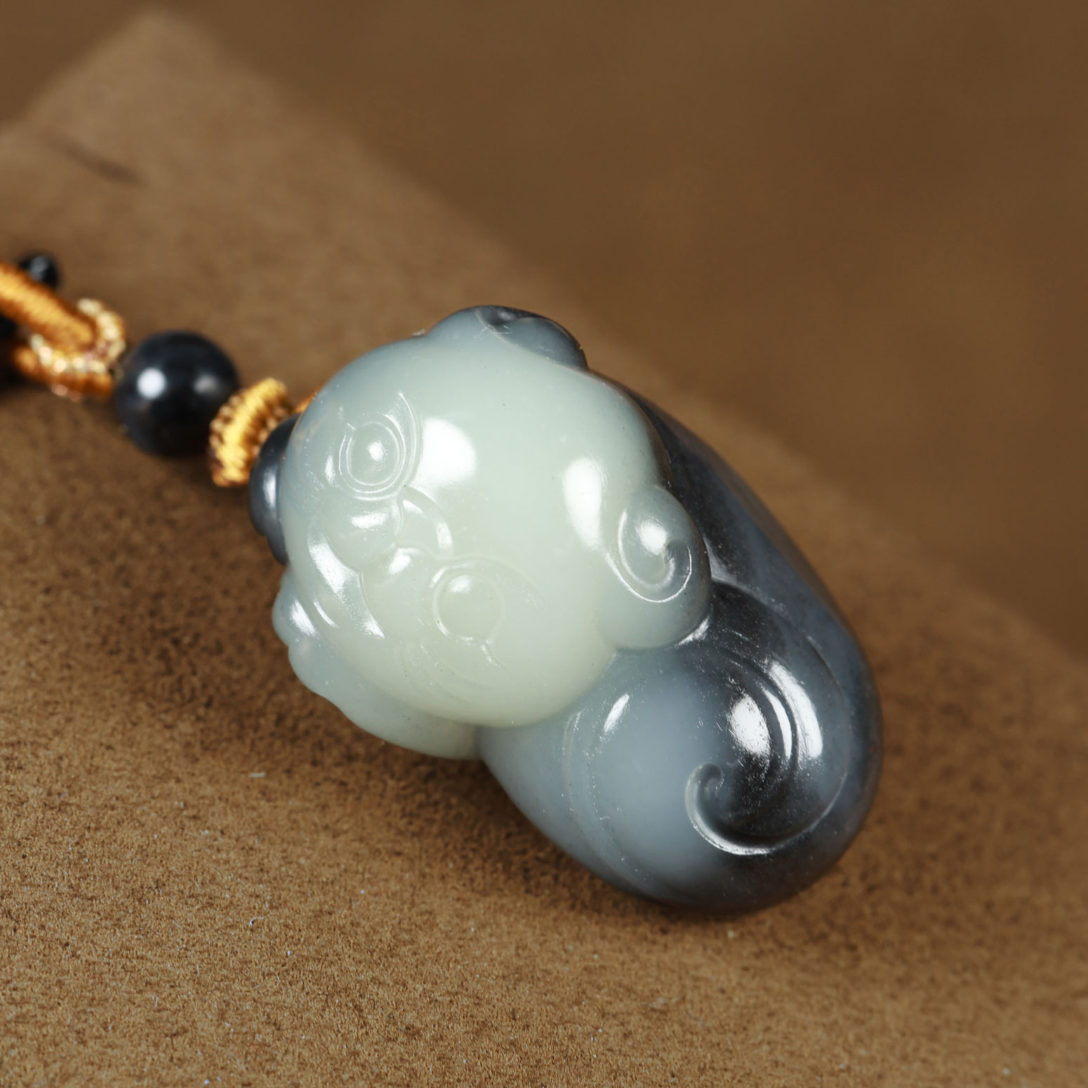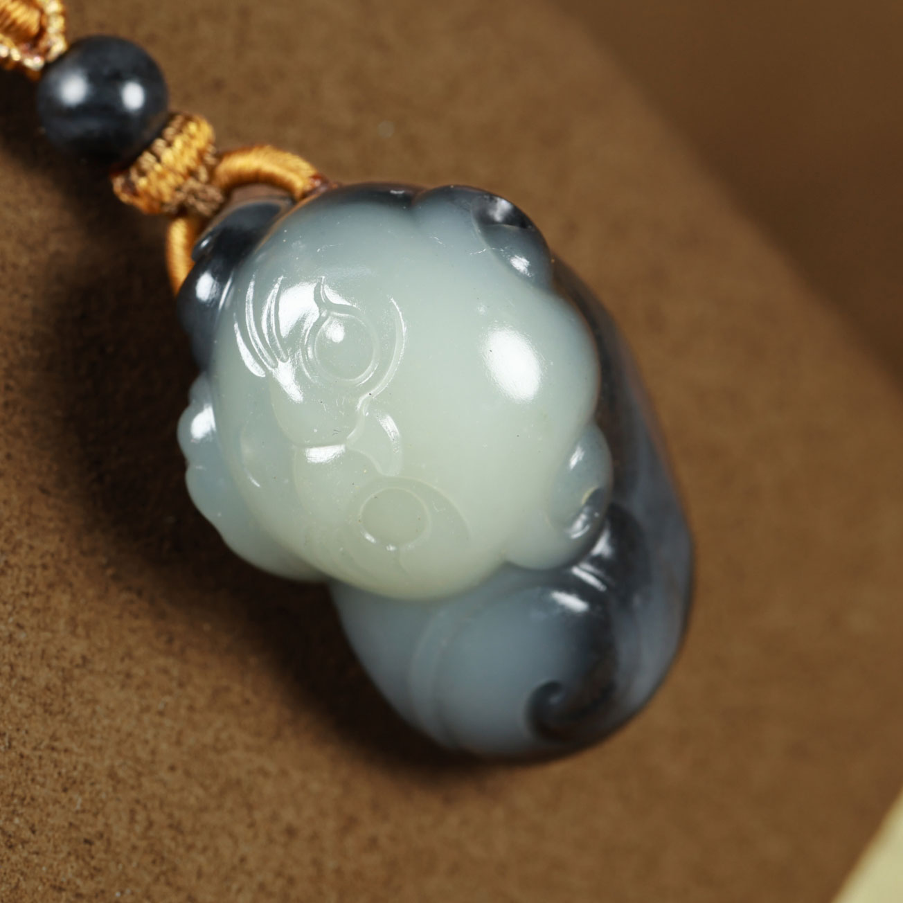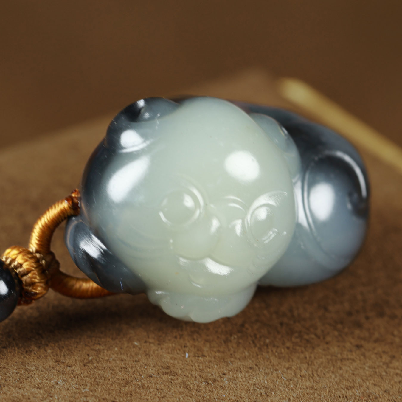 This Hetian Jade Blue and White Seed Material Lucky Cat Pendant is meticulously carved from selected natural Hetian blue and white seed jade. The jade texture is fine and greasy, with distinct black and white colors transitioning naturally, making it a highly distinctive category among blue and white seed materials. The carving craftsmanship is exquisite and vivid, depicting the image of the lucky cat in a charmingly naive, lively and vivid manner. The rounded and full lines complement the natural texture of the jade perfectly. Wearing it is believed to attract wealth and good fortune, with a unique charm.