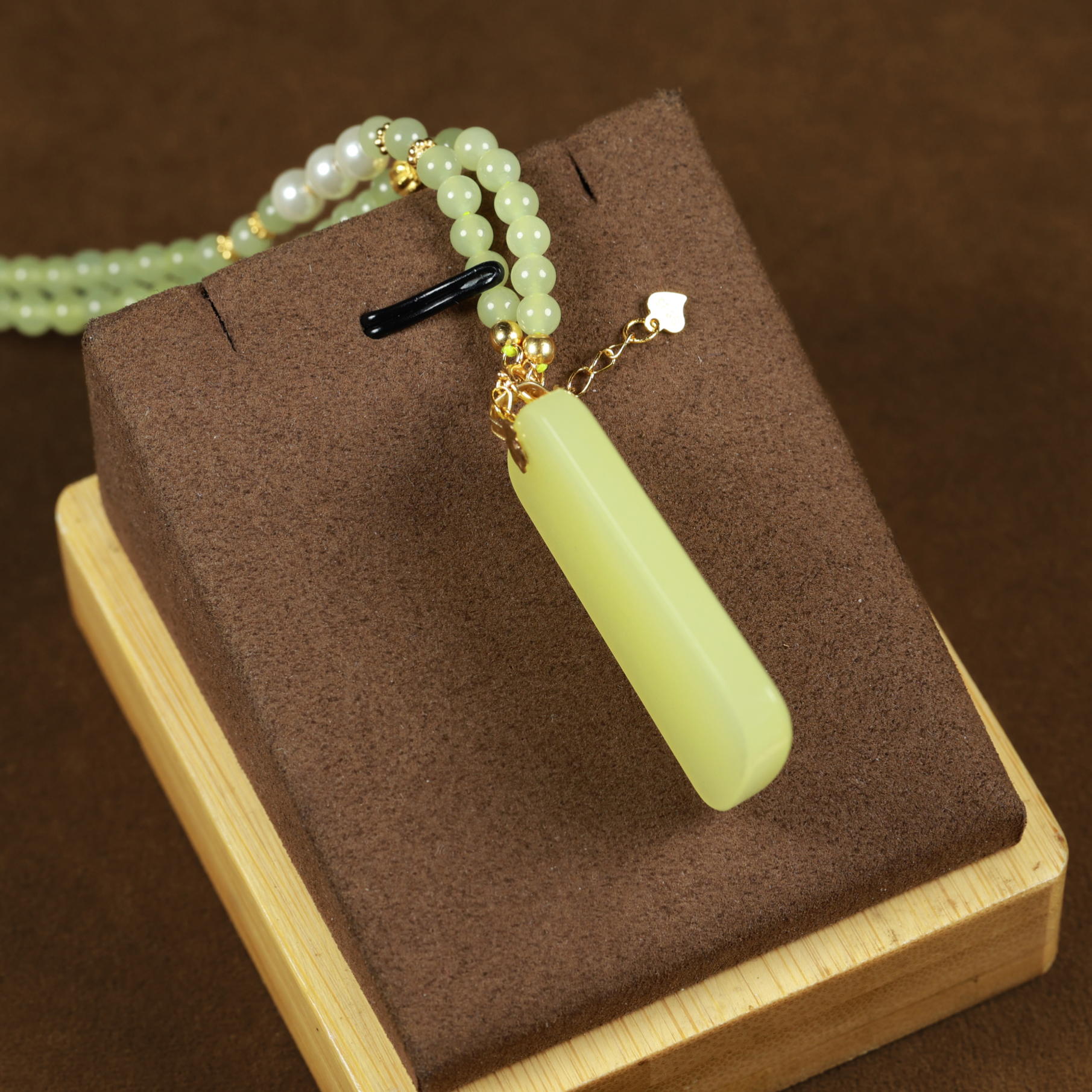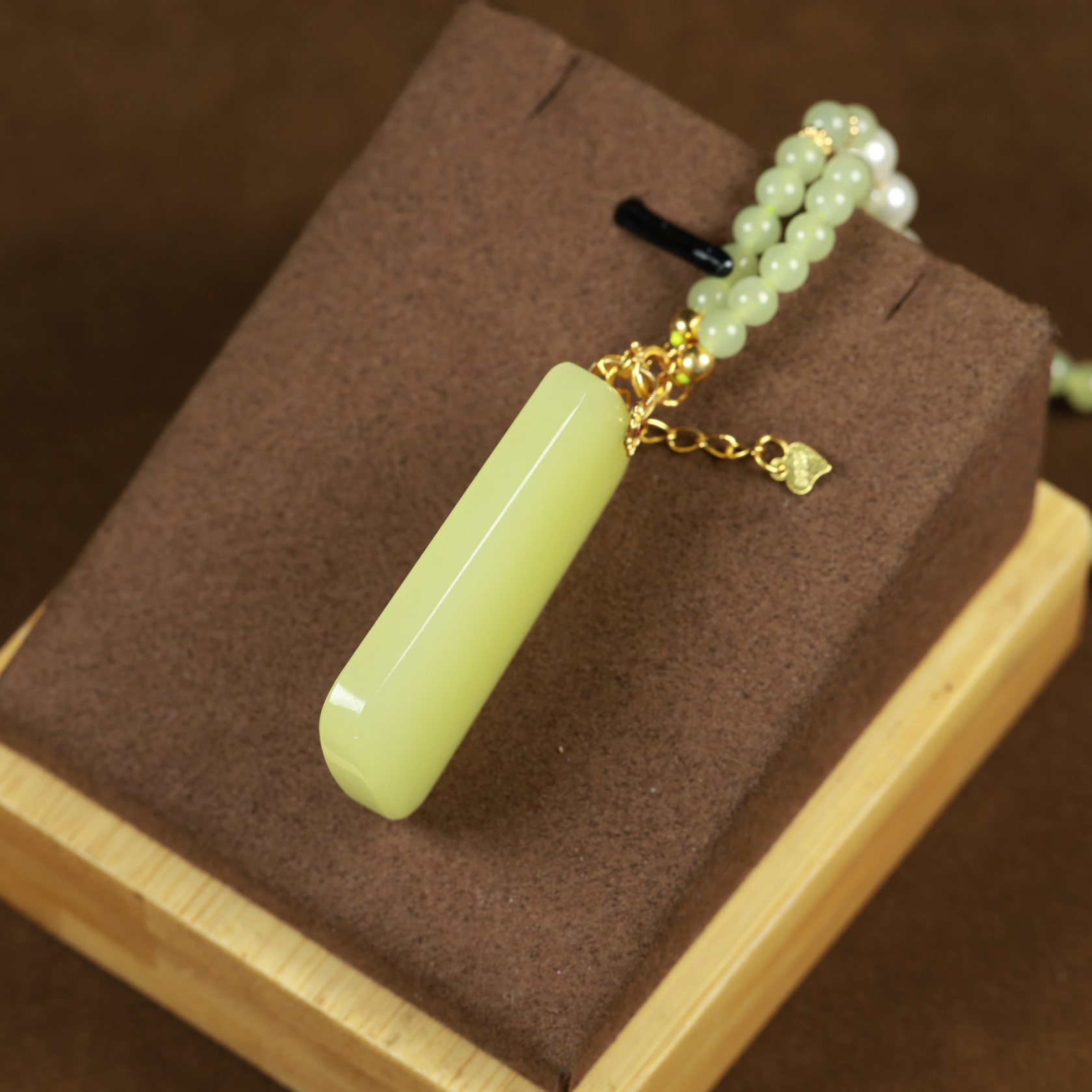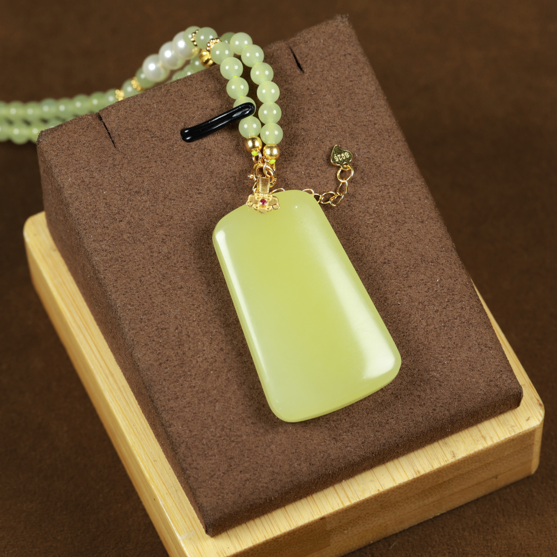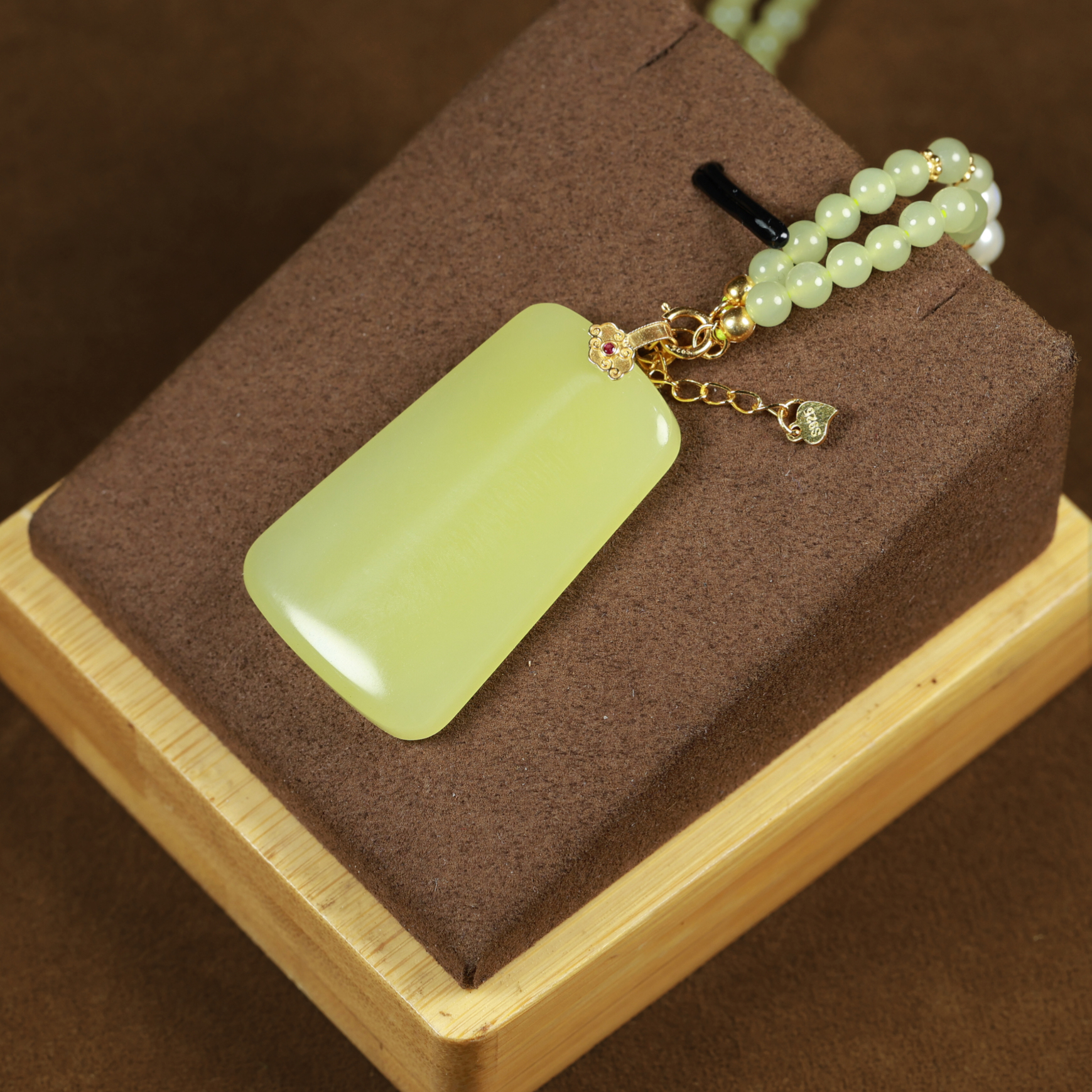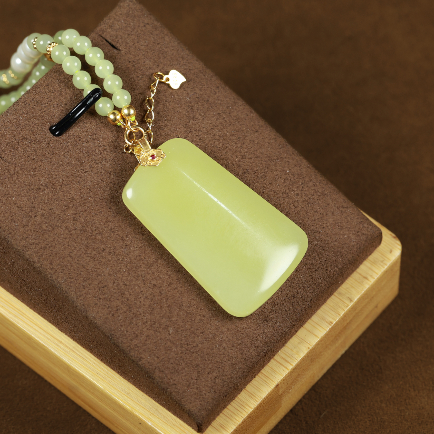 This KGold yellow jade pendant with chain features delicate and dense jade texture, with a uniform structure and no impurities. The jade color is a pure chicken-fat yellow, resembling ripe chestnuts in autumn or the bright, warm hue of melted chicken fat. There are no traces of impurities or color variations. The pendant symbolizes good luck and safety. Simple yet luxurious, it is an excellent choice for enhancing overall styling.